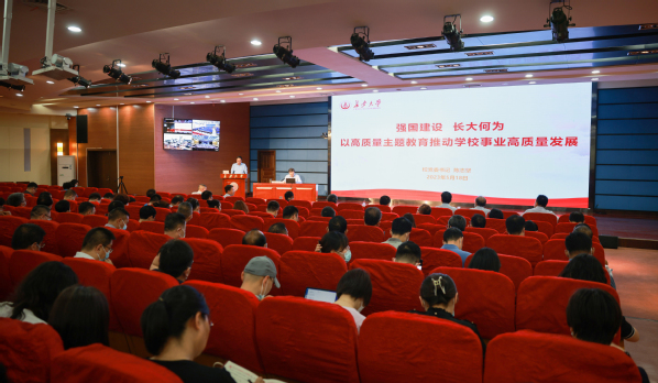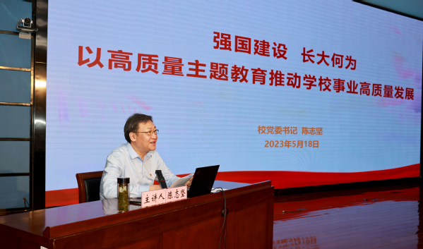 5月18日下午,学校在北校区北辰会议中心二层报告厅举办学习贯彻习近平新时代中国特色社会主义思想主题教育专题党课,校党委书记陈志坚以《强国建设、长大何为——以高质量主题教育推动学校事业高质量发展》为题作报告,教育部第九巡回指导组组长徐慧、副组长朱健梅、成员许书宏与会指导。专题党课由校党委副书记徐引正主持。