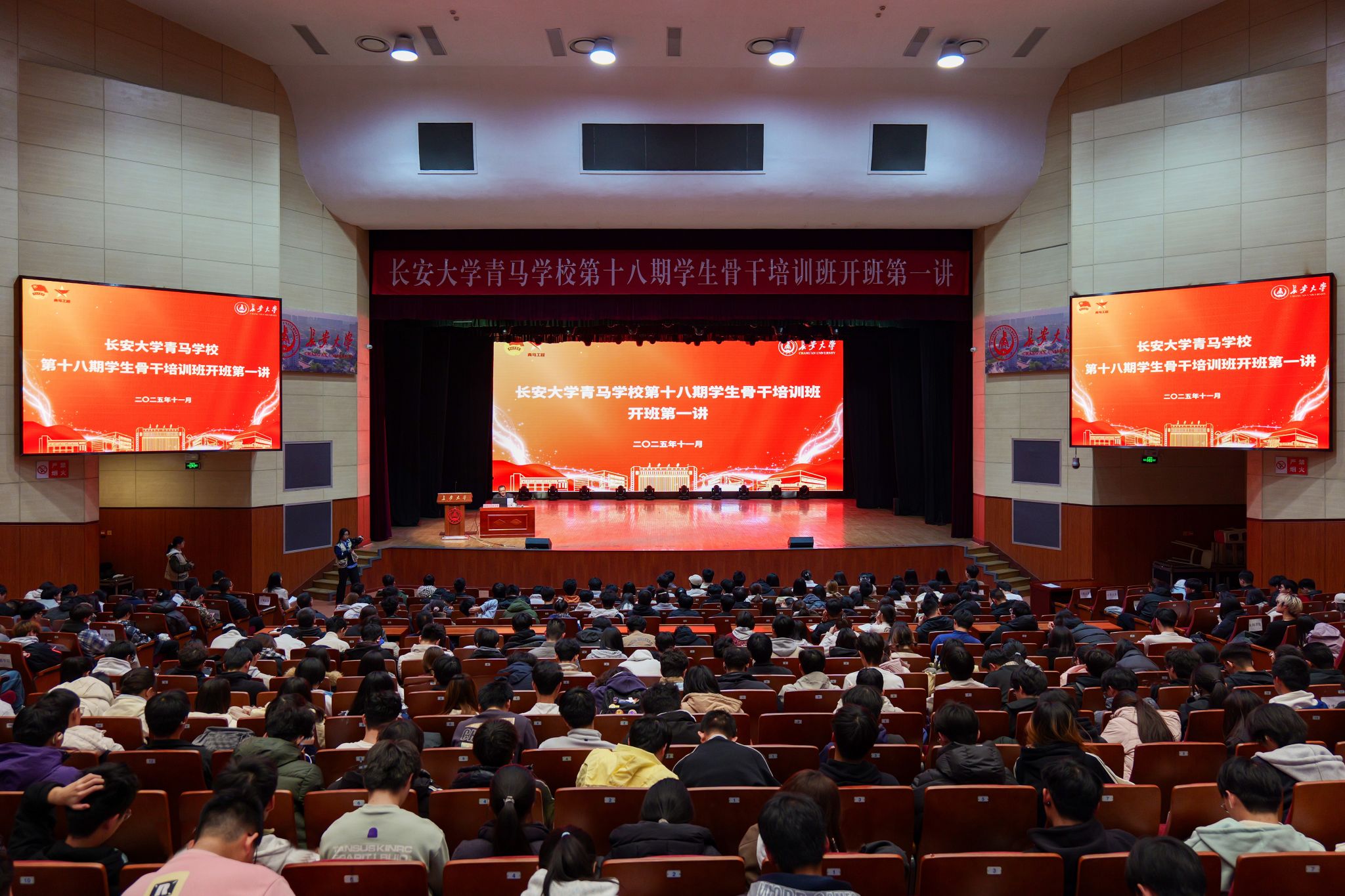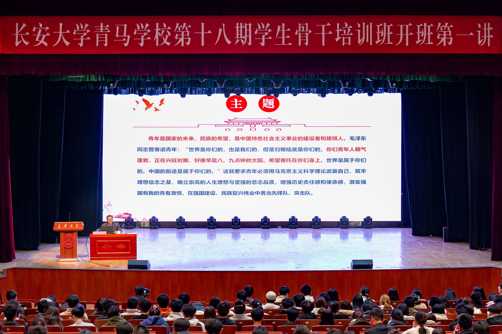 为深入学习贯彻习近平新时代中国特色社会主义思想,全面贯彻党的二十大和二十届历次全会精神,推进我校青年马克思主义者培养工作走深走实,切实提升学生骨干的政治素养与理论水平,11月25日晚,葡京集团网站青马学校第十八期学生骨干培训班开班第一讲在北校区长安文化艺术中心大礼堂举行。校党委书记陈志坚作题为《感悟思想伟力,挺膺时代担当,做新时代坚定的青年马克思主义者》专题报告。校团委书记丁芝娟主持活动。