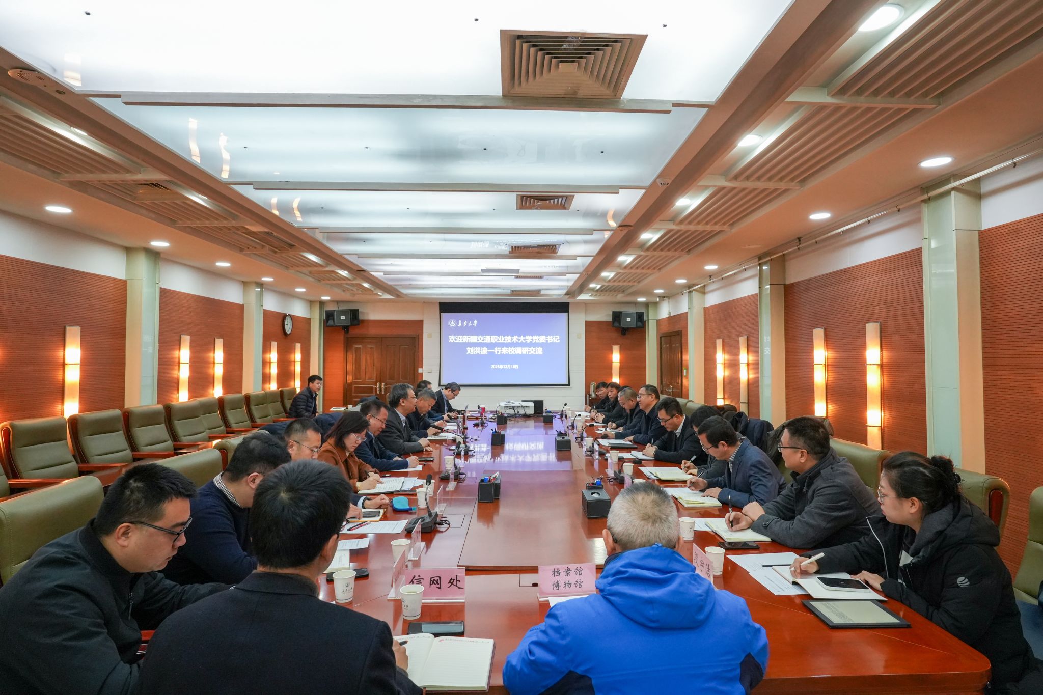 12月18日上午,新疆交通职业技术大学党委书记刘洪波、副校长赵煜一行来校调研交流。校党委书记陈志坚出席座谈会,副校长裴建中主持座谈会。